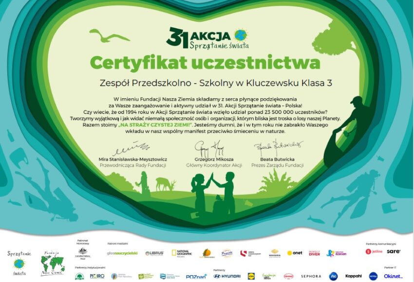 Miło nam poinformować, że uczniowie naszej szkoły otrzymali Certyfikat od Fundacji Nasza Ziemia, potwierdzający udział w 31. Akcji Sprzątanie świata – Polska pod hasłem ,,NA STRAŻY CZYSTEJ ZIEMI”.